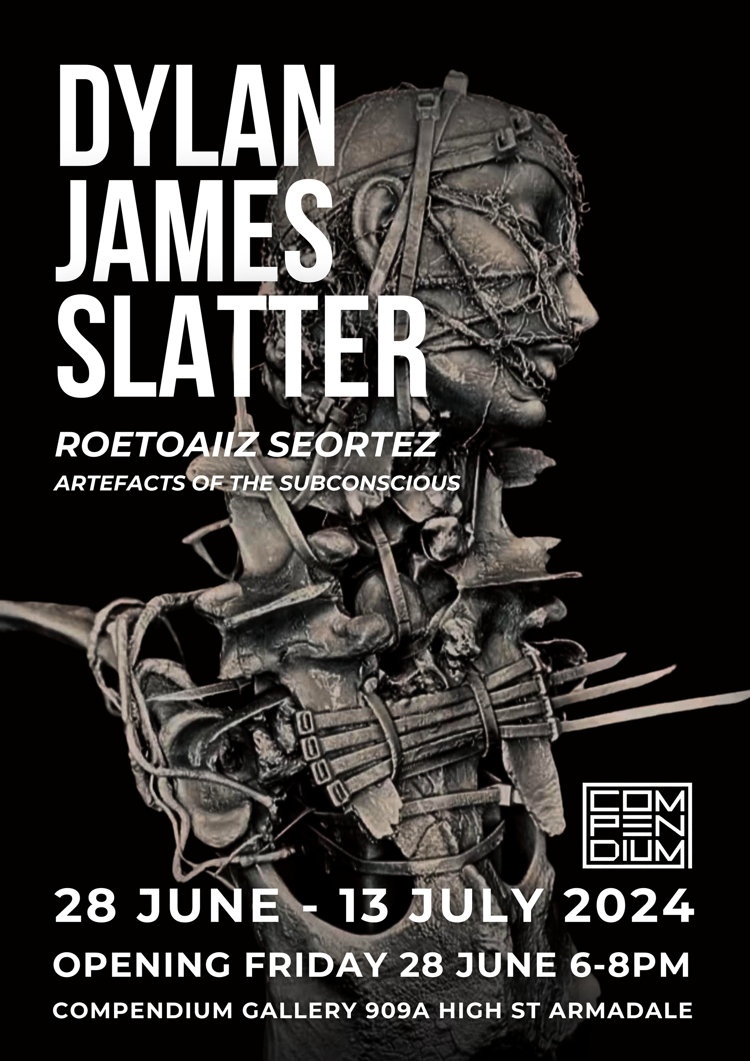 A new direction for Compendium Gallery, we are proud to house the results of Dylan James Slatter’s subconscious in his exhibition Roetoaiiz Seortez - Artefacts of the Subconscious. A key ideology for Slatter is dreams and the way in which our subconscious is at the forefront of our creative genius, rather than that of the conscious mind. Having had his dreams studied via EEG brainwave mapping at Monash University in order to gain a better understanding of how his unconscious mind is able to manifest such an aesthetic he creates in his works, the idea of birth and rebirth was a constant theme that was surfacing through his psyche. This is evident in his choice to have each of his works accompanied by a birthing meteor.