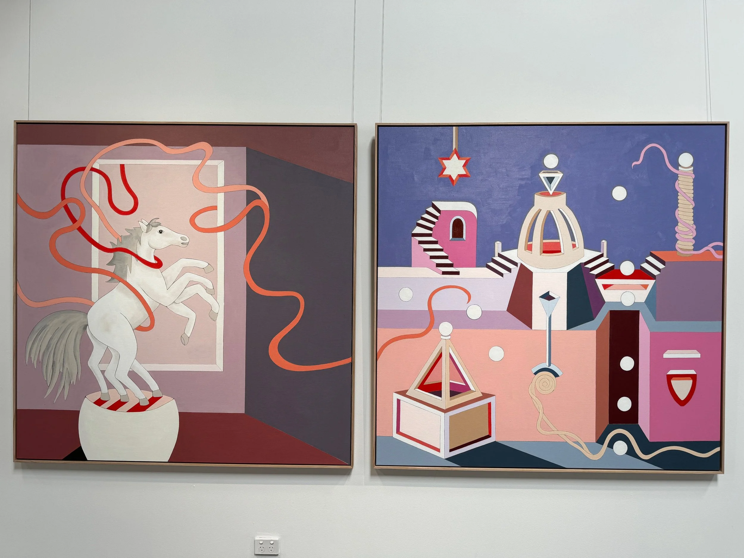 For Jasmine the process, ritual and labour of painting itself are of integral importance to the finished piece, as are the intentions and musings that are imbued in every brushstroke. Her subject matter combines architectural forms and geometric imaginings which are used as metaphors to tell stories around our shared human experience. The drawing in, meditative and contemplative value of the paintings are meant to be an antidote to our busy, technological and image rich daily lives. Over the last nine years Jasmine has extended her studio practice to include both large scale wall art, sculptural and installation pieces which further examine the themes present in her painted works.
